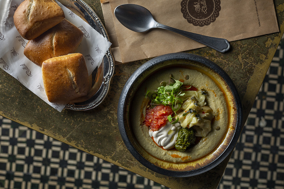 (Red & green endive, arugula, cucumber, green beans, chili, mint & coriander, seasonal fruit & blue cheese), the Roasted Artichokes (Tomato vinaigrette, chimichurri, parmesan cream & shaving) or the Fish Shawarma (Grilled fish on hummus cream, onion & sumac with green herbs & coriander).