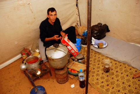 We also woke up by the smell of fresh bread. You unzipped your tent and there he was again, the cook on his haunches, busy poking at the ashes of the fire with a stick. Next to him was a plastic container with the dough. Each time he took a piece out, flattened it between his hands, and made it wider by twisting it around like a lasso between both hands. And hop, briefly on both sides of the ashes and in no time the bread was baked. This scene unfolded in front of me every morning and evening and strangely enough I found it very soothing to watch.
