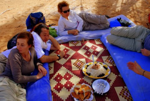 Around 5 o'clock we stopped, set up the tents, washed ourselves (with wet washcloths from a package or with a small towel and some water from a large water bag dangling from a camel) and sat on mats in front of the tent where the cook prepared our food.